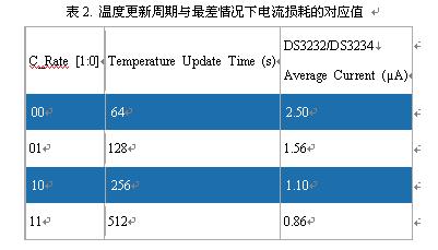 表2列出了DS3232/DS3234溫度更新周期與最差情況下電流損耗的對應值。計算中假設電池電壓為3.63V,I²C兼容接口不工作。C_Rate位上電時默認為0,對應於64s的溫度更新周期。
