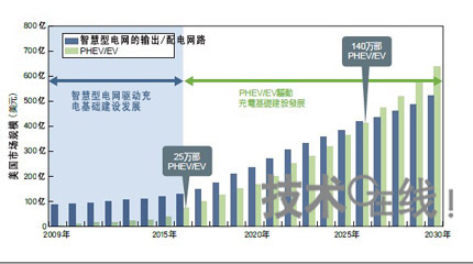 美國的充電基礎設施一開始將慢慢地隨著智能電網市場成長,而非PHEV/EV市場。智能電網的傳輸和分配網路升級的市場規模預估是依Morgan Stanley的資料製成。PHEV//EV市場規模是依據EPRI市場滲透率來預估,以每台30000美元換算。