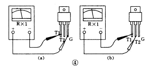 (2)把黑表筆接T1極,紅表筆接T2極,電阻為無窮大。接著用紅表筆尖把T2與G短路,給G極加上負觸發信號,電阻值應為十歐左右(參見圖4(a)),證明管子已經導通,導通方向為T1一T2。再將紅表筆尖與G極脫開(但仍接T2),若電阻值保持不變,證明管子在觸發之後能維持導通狀態(見圖4(b))。
