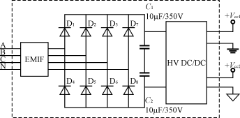 這zhe種zhong供gong電dian方fang式shi體ti積ji和he重zhong量liang較jiao大da,成cheng本ben也ye較jiao高gao,顯xian然ran按an以yi上shang電dian路lu連lian接jie時shi,對dui三san相xiang四si線xian供gong電dian時shi不bu能neng缺que零ling線xian,對dui三san相xiang三san線xian供gong電dian時shi不bu能neng缺que公gong共gong地di線xian,如ruB相;另外,有的供電局用戶要求,三相電度表輸入端任意兩線有電壓輸入時都能工作,則圖5的設計便不能達到目的;當采用三相電度表專用開關電源模塊供電時,可解決以上問題,其內部結構圖如圖6所示。