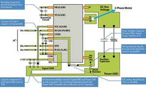 與電壓源變頻器的分立元件方案類似,采用智能功率模塊時也要注意外部元件的布局安排。圖3所示為針對Motion-SPMTM應用的一些建議。由於電壓源變頻器的開關速率很快,信號接地和功率接地必須分開。兩種接地在15VVcc電容處互接。Vcc電容和功率接地之間的通道要狹窄,以去除耦合。為防止電湧造成破壞,引腳P與功率接地之間應當有一個低電感電容。另外,由於電壓源變頻器和馬達之間的長引線會造成高壓反射,因此一些SPM產品配備了外接柵極電阻來調節開關速率和最大限度地減少反射。