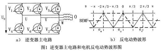 實現無刷直流電機電子換相及PWM控製的逆變器主電路如圖1a所示。采用兩兩通電方式,即每一個瞬間有兩個功率管導通,每隔60°電角度換相1次,每一功率管導通120°電角度。功率管的導通順序是:V6V1→V1V2→V2V3→V3V4→V4V5→V5V6。