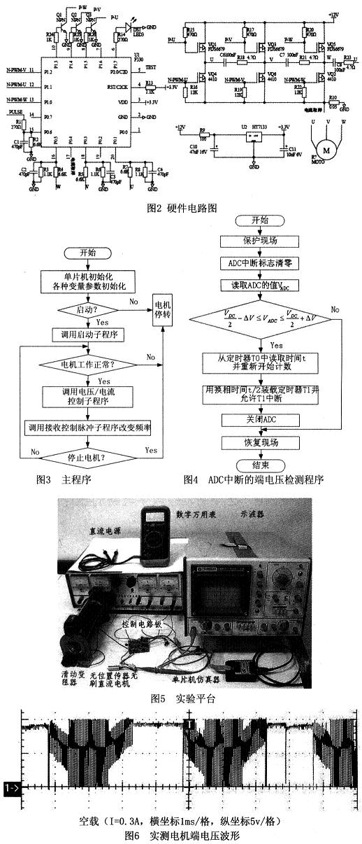 無刷直流電機的無位置傳感器控製的難點在於轉子位置信號的檢測,目前國內外研究人員提出了諸多方法,其中反電動勢法最為簡單、可靠,應用範圍最廣泛。普遍采用的控製方案為基於DSP的控製和基於專用集成電路的控製等,但是其價格高、體積大,不利於用在微型電機控製器中。本文介紹基於C8051F330單片機、檢測反電動勢法的無位置傳感器無刷直流電機的控製器,係統結構簡單,體積超小型,價格低廉,運行性能良好。