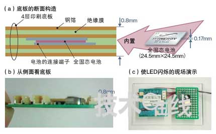 衝Printed Circuits在厚度為0.8mm的4層印刷底板上內置了IPS開發的厚0.17mm的全固態鋰離子充電電池(a,b)。