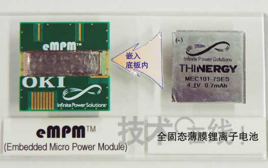 不僅是電容器及IC,就連電池也開始內置在印刷底板中。衝Printed Circuits試製出了內置薄型全固態鋰離子充電電池的4層印刷底板,並在2010年6月舉辦的安裝技術國際展會“JPCA Show 2010”上進行了參考展示。“已開始與多家設備廠商討論使用方法,希望最早於2011年啟動業務”(衝Printed Circuits技術本部商品開發部擔當部長中澤哲夫)。
