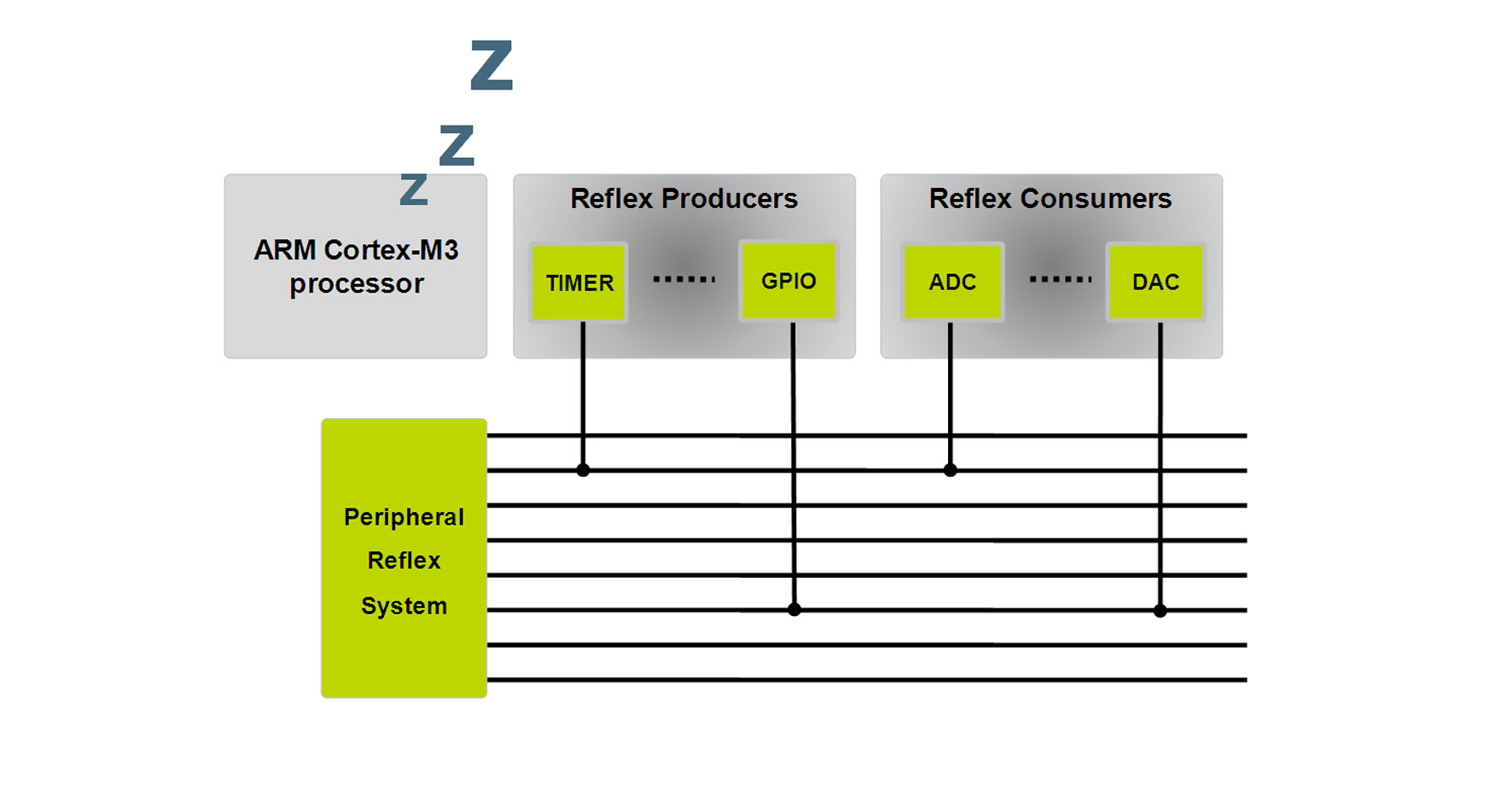 盡管有一個高效的32位處理器內核資源,Energy Microgongsideshejirenyuanrenshidaozaidianxingyingyongzhonghaiyouhenduogongnengmeiyoudadaoquanmiandechulinengli,ruguozaidaijizhuangtaixia,jishishizuijienengdeneiheyehuishiyongjiaoshaodedianyuan。hebiaozhunde32位一樣,ARM架構總線與芯片上所有的功能性模塊互聯,一個輔助總線或互連矩陣被稱為外圍設備反射係統。如圖4所示,使用該互連,外圍設備就能從ARM內核中與外圍設備溝通,無任何幹擾。