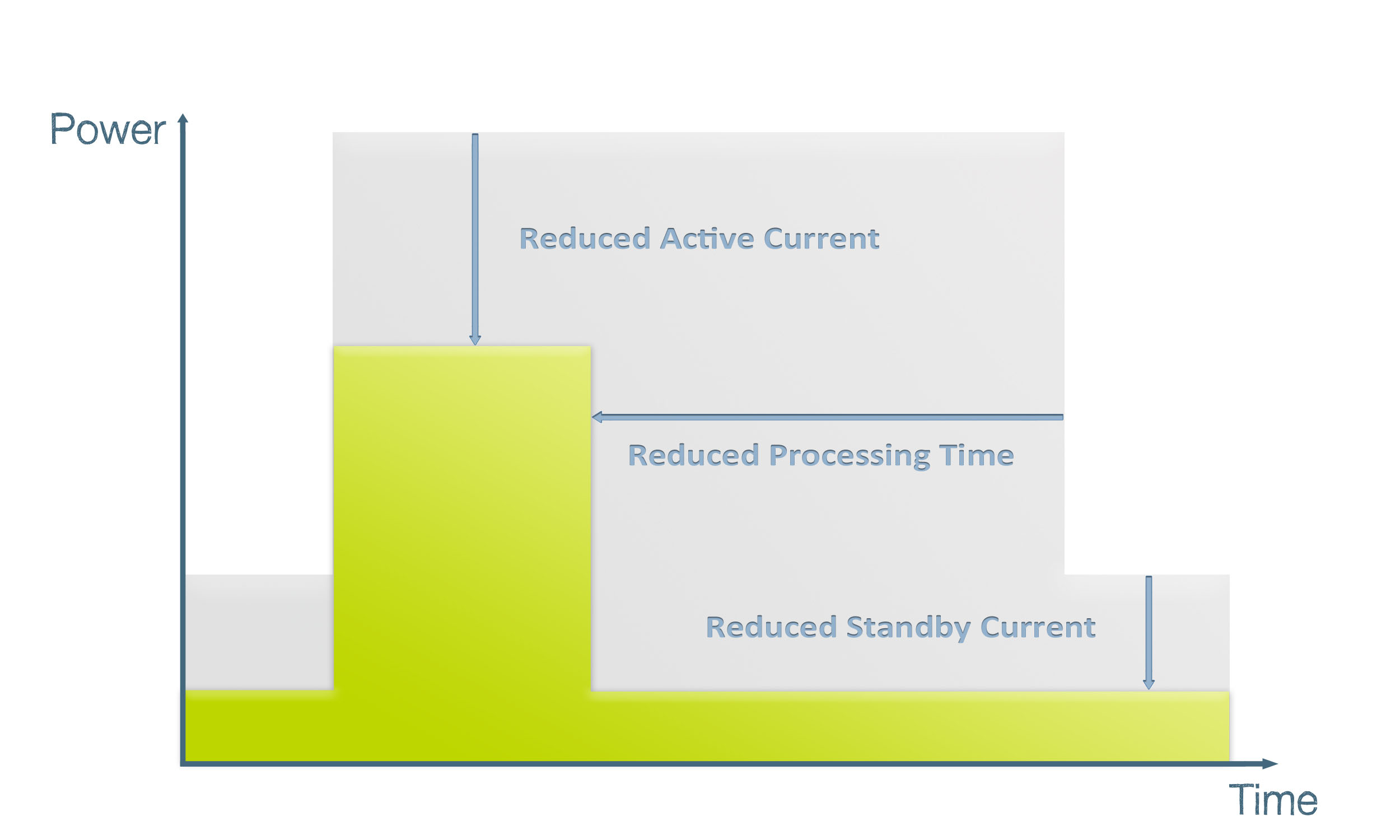 圖1:一個節能MCU內核可通過完整的喚醒/操作/返回睡眠周期節省幾個不同區域的能量。藍色區域表示一個更強大的32位內核完成任務所節省的能量,所需的周期比一個8位內核需要的少,在活躍和睡眠模式下消耗的電流也較少。