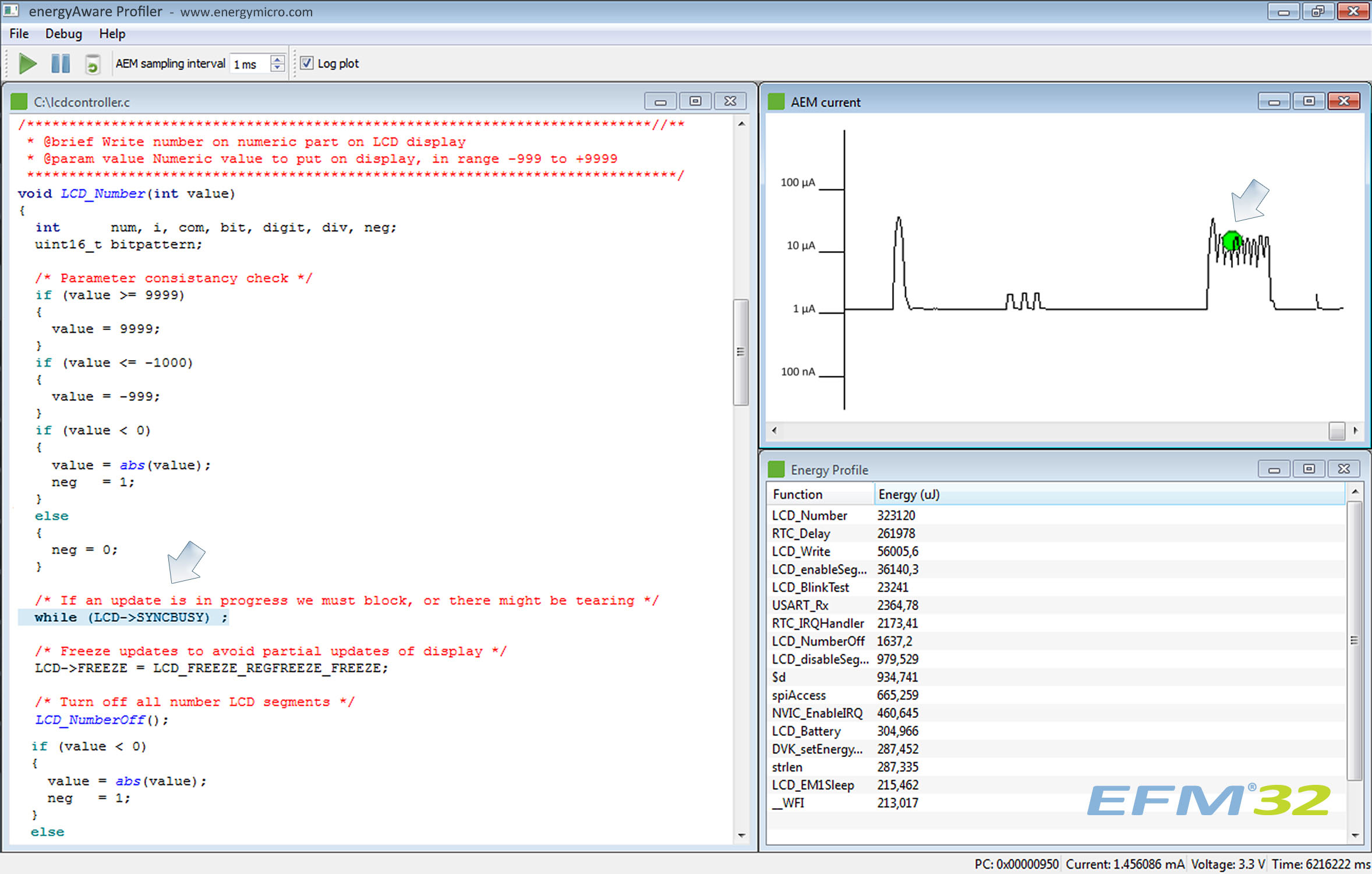 energyAware Profiler是用於PC的一種能量調試工具,它采用了現有的EFM32 Gecko開發工具包中的專用Advanced Energy Monitoring (先進能源監控AEM)係統。AEM能顯示開發工具包裏印刷線路板上液晶顯示器應用的實時耗電量,如圖3所示,在運用Profiler軟件時,能源調試的真正能量才得以實現。