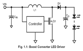升壓電路是用來驅動LED的串聯電壓高於輸入電壓(圖1),並且有以下的特色:
