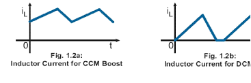 升壓電路可操作於二種模式,連續導通模式(ContinuousConductionMode;CCM)或不連續導通模式(DiscontinuousConductionMode;DCM),這二種模式是由電感電流的波形決定的。圖2a為CCM升壓電路的電感電流波形,圖2bDCM升壓電路的電感電流波形。