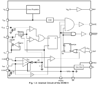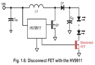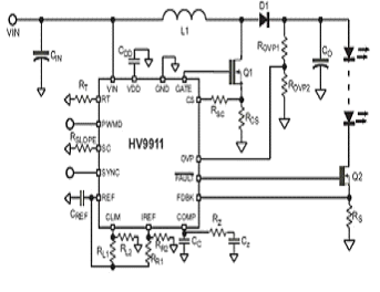 HV9911為CloseLoop,PeakCurrentControl,SwitchingModeLED驅動電源控製IC,它內建了許多功能來客服升壓電路的缺點。HV9911包含了9-250VDC輸入電壓穩壓器,不需額外電源,僅由單一輸入電壓提供IC動作的工作電源。它內建了2%精密的參考電壓(全溫度範圍)能精確地控製LED串聯電流。並且包含了斷路用的FET驅動電路。當輸出短路或過電壓時,便會自動斷開LED串之對地路徑。此功能縮短了控製電路的反應時間(請參考PWM調光電路說明)。(圖3)