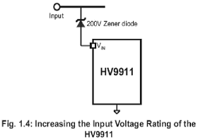 IC內部提供穩壓電路9∼250V輸入電壓,可輸出7.75V電壓輸出提供IC內部電源使用,若輸入電壓範圍提升可經由外接一個200V,2WZenerDiode於輸入電壓與IC的Vinpin之間(如圖1-4),這可使得輸入電壓範圍可提升至450VDC,亦可以使得IC內部穩壓電路所產生的功率損耗分散一部份在ZenerDiode上。