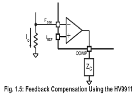 閉回路控製的形成是連接輸出電流信號至FDBKpin,同時將電流參考位準連接至IREFpin,補償網絡連接至Comppin(傳導運算放大器的輸出端),如圖5所示。放大器的輸出受PWM調光信號所控製,當PWM調光信號為High時放大器的輸端連接至補償網絡,當PWM調光信號為Low時,放大器的輸出端與補償網絡被切斷,因此補償網絡內的電容電壓維持住,一直到PWM調光信號再度回複High準位時,補償網絡才又連接圖放大器的輸出端,這樣可確保電路動作正常以及獲得非常良好的PWM調光反應,而不需要設計一個快速的控製電路。