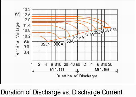 上圖是蓄電池生產廠家提供的150AH/12V蓄電池放電曲線。在實際使用時根據不同的負載電流選定不同的放電終止電壓。在該放電曲線中,以10小時放電和5小時放電曲線為例,對於10小時放電(負載電流為15A)來說,如果放電到終止電壓11V(44V),此時蓄電池放出的容量大約為100%。一般情況下,為了保護蓄電池盡量避免其深度放電,放電深度最好≤80%,終止電壓在46V左右,放電時間約為8小時。對於5小時的放電率來說(負載電流為25.2A),終止電壓10.8V(43.2V)放出100%容量,在實際使用時放電深度≤80%,終止電壓在45.6左右,放電時間為4小時。