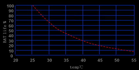 失水的途徑比較多:節流閥設計不合理,頻繁開啟;電源對蓄電池頻繁均充;環境溫度過高。其中高溫是最主要的因素,高溫會加速蓄電池失水速度,導致蓄電池容量下降。以25℃為基準,當蓄電池運行環境上升10℃,壽命減少50%。如圖2所示。