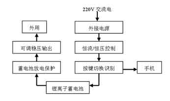 從手機鋰離子二次電池的恒流/恒壓充電控製出發,用220V交流電通過配置的內置儲能鋰電池對手機鋰離子電池充電。電路的具體工作流程如圖1所示。