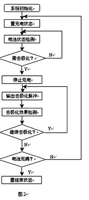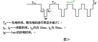 整個係統的控製過程為:蓄電池組開始充電一段時間後,檢測電池電壓,當達到電池出氣點電壓(約2.4V/單體)時,停止充電,然後進行大電流(約2C)放電去極化,時間為1ms,充放電曲線如圖3所(suo)示(shi)。放(fang)電(dian)後(hou),再(zai)檢(jian)測(ce)電(dian)池(chi)狀(zhuang)態(tai),進(jin)行(xing)去(qu)極(ji)化(hua)效(xiao)果(guo)檢(jian)測(ce),達(da)到(dao)去(qu)極(ji)化(hua)效(xiao)果(guo)則(ze)回(hui)轉(zhuan)充(chong)電(dian),否(fou)則(ze),再(zai)次(ci)進(jin)行(xing)去(qu)極(ji)化(hua)放(fang)電(dian),直(zhi)至(zhi)達(da)到(dao)去(qu)極(ji)化(hua)要(yao)求(qiu)的(de)效(xiao)果(guo)才(cai)回(hui)轉(zhuan)充(chong)電(dian)。如(ru)果(guo)連(lian)續(xu)放(fang)電(dian)n次(n=3),電池電壓變化很小,則充電完成並結束充電狀態。
