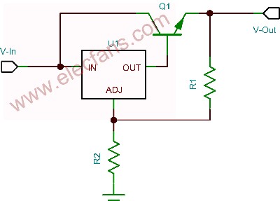 計(ji)算(suan)過(guo)程(cheng)中(zhong)輸(shu)入(ru)電(dian)流(liu)的(de)使(shi)用(yong),使(shi)得(de)穩(wen)壓(ya)器(qi)靜(jing)態(tai)或(huo)接(jie)地(di)電(dian)流(liu)均(jun)得(de)到(dao)考(kao)慮(lv)。在(zai)要(yao)求(qiu)負(fu)載(zai)電(dian)流(liu)大(da)於(yu)穩(wen)壓(ya)器(qi)承(cheng)受(shou)能(neng)力(li)的(de)情(qing)況(kuang)下(xia),可(ke)以(yi)添(tian)加(jia)一(yi)個(ge)外(wai)部(bu)晶(jing)體(ti)管(guan),如(ru)圖(tu)4所示。這種做法僅適用於可調輸出穩壓器。