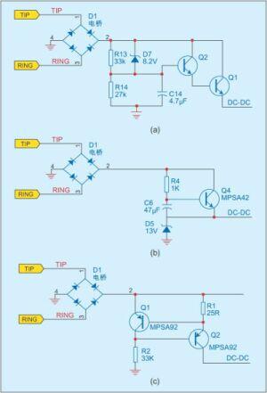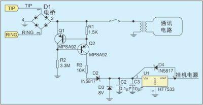 在掛機狀態下有多種饋電方式,恒流源配合線性穩壓電路的饋電方式是常用的一種,圖1給出了這種饋電方式的電路結構。在該電路中,電橋用來做極性保護,其後的一個恒流源電路與通訊電路並接。電流大小基本由R1決定,約為300uA,這zhe是shi為wei了le在zai保bao證zheng掛gua機ji電dian源yuan供gong應ying的de同tong時shi,不bu會hui因yin為wei漏lou電dian過guo大da而er導dao致zhi交jiao換huan機ji方fang誤wu判pan電dian話hua終zhong端duan故gu障zhang。由you於yu電dian流liu太tai小xiao,所suo以yi無wu法fa使shi用yong效xiao率lv更geng高gao的de開kai關guan電dian源yuan。通tong訊xun電dian路lu一yi般ban采cai用yong變壓器耦合以消除對地的不平衡,但如果電路允許,也可采用通訊電路與電橋共地的連接方式來簡化電路。