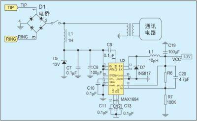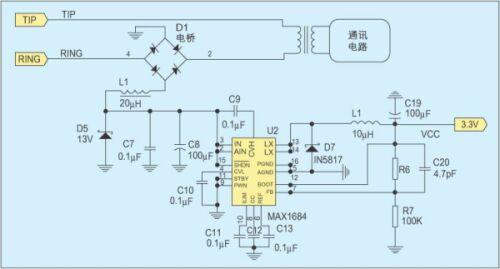 摘機饋電電路大致分為兩類,饋電電路與通訊電路並聯的屬於並聯饋電,饋電電路與通訊電路串聯的屬於串聯饋電。圖2是一種常用的並聯饋電電路,大電感L1保證直流饋電不會影響交流信號。對於惡劣的線路狀況,如5km長的用戶線路,若不考慮通訊電路的影響,齊納管D5上的電壓最大為15V,功率可達340mW。當線路狀況更加惡劣時,將齊納管D5上的電壓降低到13V,則可獲得300mW左右的功率。利用MAXIM公司的開關頻率為600KHz,效率可達95%的高效DC/DC轉換器MAX1685,將這個電壓轉換成3.3V就可獲得85mA的電源電流。