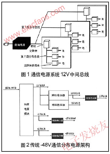 [page]圖2示出dc-dc隔離電流模塊和POL負載點變換器如何配置成典型的分布電源係統,提供多輸出電壓和電流。來自前端ac-dc電源的DC電壓(-36~-72V)饋入一個隔離的電源模塊,此模塊代表一個總線變換器。模塊完全是隔離ac-dc變換器,有不同的形式(全磚、半磚、1/4磚),具有標準的占位麵積,引腳輸出和散熱能力。POL變換器可以是開關穩壓器(降壓或升壓穩壓器)和(he)線(xian)性(xing)穩(wen)壓(ya)器(qi)的(de)組(zu)合(he)或(huo)僅(jin)是(shi)線(xian)性(xing)穩(wen)壓(ya)器(qi),這(zhe)取(qu)決(jue)於(yu)所(suo)供(gong)電(dian)的(de)電(dian)路(lu)要(yao)求(qiu)。靈(ling)敏(min)電(dian)路(lu)需(xu)要(yao)低(di)噪(zao)聲(sheng)線(xian)性(xing)穩(wen)壓(ya)器(qi),而(er)高(gao)效(xiao)率(lv)開(kai)關(guan)穩(wen)壓(ya)器(qi)是(shi)必(bi)須(xu)有(you)最(zui)小(xiao)功(gong)耗(hao)的(de)電(dian)源(yuan)係(xi)統(tong)的(de)選(xuan)擇(ze)。