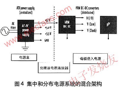 可以用集中和分布單元的組合設計電源係統,如圖4所示的混合電源係統。集中電源產生5.0V和3.3V邏輯電源(其輸入為ac線)以及分布到電壓穩壓器模塊(VRM)的12Vdc電平。用VRM為高性能處理器提供很大電流、低電壓芯核和I/O電壓。VRM電源變換器放置在母板靠近處理器的“負載點”處,這可減少電路板跡線電壓降,在不同的情況下,跡線電壓降對於有效的變換器工作是不能接受的。