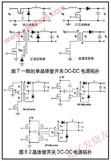 單晶體管拓撲(圖7),如降壓、升壓、正激、反激是在分布係統(高達100W)中設計用於相當低功率負載的dc-dc變換器。降壓和升壓電路是非隔離的,而正激和反激變換器提供變壓器隔離。