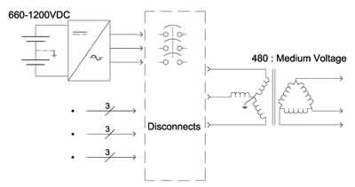 過采用可分離的兩極+600和-600VDC電(dian)池(chi)組(zu)數(shu)組(zu)實(shi)現(xian)直(zhi)接(jie)轉(zhuan)換(huan)這(zhe)項(xiang)新(xin)技(ji)術(shu),無(wu)需(xu)在(zai)低(di)壓(ya)三(san)相(xiang)電(dian)網(wang)上(shang)配(pei)備(bei)變(bian)壓(ya)器(qi)。這(zhe)種(zhong)配(pei)置(zhi)不(bu)僅(jin)提(ti)高(gao)了(le)發(fa)電(dian)效(xiao)率(lv),而(er)且(qie)不(bu)需(xu)要(yao)傳(chuan)統(tong)上(shang)所(suo)要(yao)求(qiu)使(shi)用(yong)的(de)逆(ni)變(bian)器(qi)變(bian)壓(ya)器(qi),降(jiang)低(di)了(le)相(xiang)關(guan)的(de)係(xi)統(tong)平(ping)衡(heng)(BoS)成cheng本ben,還hai避bi免mian了le與yu單dan極ji配pei置zhi有you關guan的de不bu必bi要yao的de線xian路lu衰shuai減jian。這zhe項xiang技ji術shu還hai為wei電dian力li集ji成cheng商shang和he公gong用yong電dian力li事shi業ye機ji構gou的de大da型xing商shang業ye或huo公gong用yong安an裝zhuang項xiang目mu帶dai來lai了le更geng多duo好hao處chu。例li如ru,通tong常chang規gui模mo在zai1到2兆瓦的商業項目,在連接點位於大樓入口變壓器低壓側要求配有一至八個逆變器,並且每個逆變器都要配有單獨的、定製的隔離變壓器——即ji使shi變bian壓ya器qi已yi與yu逆ni變bian器qi集ji成cheng。而er真zhen正zheng的de無wu變bian壓ya器qi設she計ji的de逆ni變bian器qi才cai能neng支zhi持chi直zhi接jie的de連lian接jie,不bu需xu要yao任ren何he其qi它ta的de變bian壓ya器qi設she備bei和he定ding製zhi修xiu改gai,而er且qie也ye不bu會hui產chan生sheng係xi統tong平ping衡heng成cheng本ben。對dui於yu那na些xie中zhong壓ya變bian壓ya器qi連lian接jie點dian在zai5到12.7千(qian)伏(fu)之(zhi)間(jian)的(de)公(gong)用(yong)安(an)裝(zhuang)項(xiang)目(mu),可(ke)將(jiang)多(duo)個(ge)無(wu)變(bian)壓(ya)器(qi)逆(ni)變(bian)器(qi)整(zheng)合(he)成(cheng)一(yi)個(ge)大(da)小(xiao)適(shi)當(dang)的(de)標(biao)準(zhun)中(zhong)壓(ya)變(bian)壓(ya)器(qi)。變(bian)壓(ya)器(qi)可(ke)以(yi)放(fang)在(zai)電(dian)場(chang)的(de)任(ren)何(he)位(wei)置(zhi),以(yi)靠(kao)近(jin)逆(ni)變(bian)器(qi)是(shi)最(zui)合(he)適(shi)的(de)。