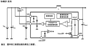 通過外接P溝道功率MOSFET或PNP晶體管、線圈、電容器和二極管,可以構成降壓型DC/DC控製器,該產品適用於移動設備的電源。主要指標:輸入電壓為2.5〜16V,輸出電壓為1.5〜6.0V,可以0.1V為進階單位來進行設定;低消耗電流工作時:60μA最大值(A、B型產品);休眠時:0.5μA最大值。振蕩頻率典型值為180kHz(A、B型產品);軟啟動功能典型值為8ms(A、B型產品);備有開/關控製功能。圖2為S-8251基本電路。