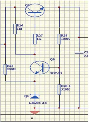 因為S-8251芯片輸入電壓範圍是2.5~16V,總線輸入電壓範圍24V,必須先經過降壓環節,這將使變換效率大打折扣。降壓電路靜態功耗要小於幾十μA量級,否則總線電流很難做到小於3.5mA。我采用MOSFET串聯降壓方式,基準源沒有采用穩壓二極管,而是使用LM385,做到靜態電流36μA。圖3為24V降壓到16V電路。