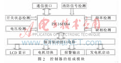 智能型雙電源開關控製器以單片機PIC16F884為核心,對兩路供電電源(常用電源和備用電源)的電壓、頻率和相位進行實時檢測。當其中一路電源(常用電源或備用電源)的電壓發生過壓、欠壓或是缺相時,控製器就會發出電機切換命令,使供電電源自動切換到另一路電源(備用電源或常用電源)上,以此來保障供電的連續性。控製器的工作方式主要有自動方式和手動方式兩種。控製器的結構框圖如圖1所示,組成模塊如圖2所示。