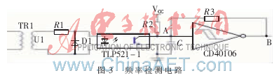 danpianjiduichangyonghebeiyongdianyuanjinxingpinlvjiance,genjujiancedejieguolaipanduandianyuanshifoufashengguzhang,ranhoujinxingxiangyingdekongzhicaozuo。pinlvjiancedianluzhuyaoyiguangouTLP521-1和施密特觸發器CD40106為主要器件構成。頻率檢測的硬件電路如圖3所示。電網中的交流電經變壓器後變換為電壓較低的交流信號U1,U1經過光耦TLP521-1後就變成了同頻率的方波信號。為了防止光耦內部的二極管被反向電流擊穿,在光耦外部反向接了1個二極管。為了使光耦輸出的方波信號更加規整,為單片機測量頻率做好準備,在光耦的輸出級加了施密特觸發器CD40106。利用PIC16F884單片機的輸入捕捉(CCP)功能記錄第一個上升沿的時間t1和下一個上升沿的時間t2,則信號的周期T=(t2-t1)μs。為了提高測量的精度,采用多次測量取平均值的方法來實現。
