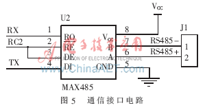 為了使控製器能夠方便地與上層控製平台進行聯網通信,實現控製器的遠程控製、遠程監控等功能,本設計為控製器添加了通信接口,采用簡單經濟、廣泛應用於工業上的RS485總線與外界進行通信。RS485采用差分信號進行傳輸,有較好的抗幹擾能力,通過轉換模塊很容易實現從RS485到RS232的信號轉換,從而便於和上位計算機通信。選用了Maxim公司的MAX485芯片作為通信控製的主要器件,其工作電源為+5V,采用半雙工通信方式,能夠將TTL電平轉換為RS485電平,內部包含了1個驅動器和1個收發器,通過串口可以方便地與PIC16F884進行通信。MAX485的接口電路如圖5所示。