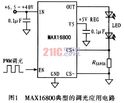 圖1為MAXl6800典型的調光應用電路。MAXl6800具有高輸入電壓範圍(達40V),可直接連接到汽車電池而不需要保護器件,保護器件一般用來抵禦電池負載變化帶來的浪湧電壓。MAxl6800能夠為LED提供恒定電流,電流值可以通過與LED串聯的檢流電阻RSENSE設置。為了提高電流設置精度,提高對外部噪聲的抑製能力,MAXl6800采用差分電流檢測輸入方式。