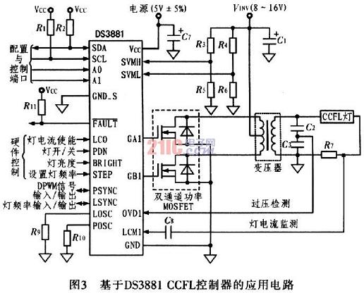 由於基本的CCFL電路中包含有外部晶體管、變壓器和燈管,CCFL架構存在EMI輻射源。圖3給出利用DS388lCCFL控製器構建的CCFL燈管電源電路,該設計優化於汽車應用環境。DS388l利用擴展頻譜和頻率偏移技術大大降低了EMI輻射,並把噪聲頻譜搬移到係統不敏感的頻段,從而克服了EMI輻射。