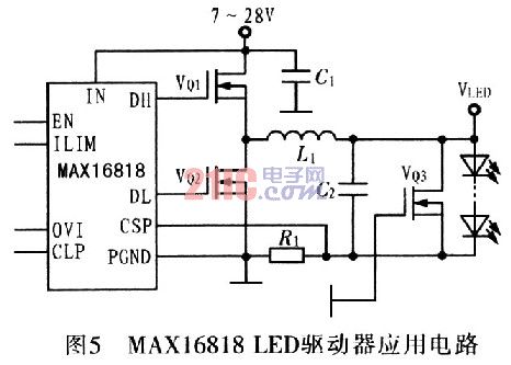 需要較高照明功率的場合,如泛光燈或霧燈,必須使用超高亮度LED(HBLED)。HBLED需(xu)要(yao)較(jiao)高(gao)的(de)驅(qu)動(dong)電(dian)流(liu),前(qian)麵(mian)討(tao)論(lun)的(de)產(chan)品(pin)無(wu)法(fa)提(ti)供(gong)低(di)成(cheng)本(ben)設(she)計(ji),需(xu)要(yao)過(guo)多(duo)的(de)驅(qu)動(dong)器(qi)產(chan)生(sheng)所(suo)需(xu)的(de)電(dian)流(liu)。最(zui)好(hao)采(cai)用(yong)能(neng)驅(qu)動(dong)大(da)電(dian)流(liu)功(gong)率(lv)管(guan)的(de)控(kong)製(zhi)器(qi),大(da)電(dian)流(liu)功(gong)率(lv)管(guan)可(ke)以(yi)為(wei)HBLED提供高達30A的電流,MAXl6818可以滿足這種設計要求,如圖5所示。