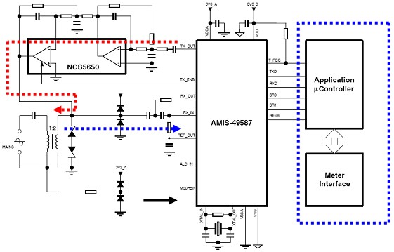 藍色箭頭表示接收路徑。變壓器從電力線耦合過來的信號經AMIS-49587內置放大器構成的低通濾波器由內部ARM進行FSK解調分析。圖中黑色箭頭是50Hz的過零檢測信號引腳。係統依靠這個信號進行同步定時。圖中藍色虛線內是電表內的應用處理器,負責應用層處理通信及計量。