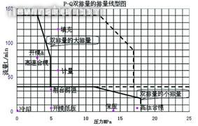 但dan其qi變bian量liang特te性xing可ke用yong來lai降jiang低di對dui伺si服fu電dian機ji的de扭niu矩ju負fu載zai,故gu降jiang低di其qi電dian流liu及ji其qi發fa熱re,使shi在zai需xu要yao極ji低di流liu量liang的de保bao壓ya,保bao壓ya時shi間jian能neng夠gou更geng長chang。這zhe在zai油you研yan公gong司si的de雙shuang排pai量liang設she計ji發fa揮hui了le出chu來lai。從cong下xia圖tu得de知zhi,保bao壓ya及ji高gao壓ya合he模mo所suo需xu的de流liu量liang低di但dan壓ya力li高gao,可ke將jiang變bian量liang泵beng轉zhuan為wei小xiao排pai量liang,降jiang低di在zai低di速su時shi伺si服fu電dian機ji的de大da電dian流liu產chan生sheng的de發fa熱re。此ci功gong能neng連lian全quan電dian機ji也ye做zuo不bu到dao。如ru不bu用yong雙shuang排pai量liang的de話hua,保bao壓ya及ji高gao壓ya合he模mo會hui超chao越yue原yuan排pai量liang的de壓ya力li流liu量liang範fan圍wei,但dan仍reng在zai虛xu線xian的de超chao載zai範fan圍wei內nei,可ke以yi作zuo短duan暫zan保bao壓ya及ji高gao壓ya合he模mo。如ru鎖suo模mo方fang法fa是shi采cai用yong機ji鉸jiao,高gao壓ya合he模mo自zi然ran是shi短duan暫zan的de。直zhi壓ya鎖suo模mo如ru不bu采cai用yong單dan向xiang閥fa將jiang鎖suo模mo力li鎖suo住zhu,便bian要yao靠kao電dian機ji油you泵beng不bu停ting地di工gong作zuo來lai維wei持chi鎖suo模mo力li。雙shuang排pai量liang的de小xiao排pai量liang能neng提ti供gong長chang時shi間jian的de保bao壓ya及ji高gao壓ya合he模mo。