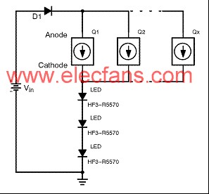 圖1:並行配置30mANSI45030恒流穩壓器以提高電流能力示例