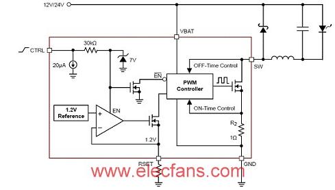 三種基本的驅動器/穩壓器拓撲結構分別是降壓、升壓、降壓-升壓(又稱為單端初級電感轉換,簡稱SEPIC)。在降壓電路中,最低輸入電壓(Vin)在所有工作條件下永遠高於LED串的最大電壓,而在最大輸入電壓始終低於LED串最小電壓時使用升壓電路。由於恒流驅動器的升壓拓撲結構屬性,它要求額外的電路,用於LED開路及輸出短路保護。圖1顯示了典型的LED降壓配置。注意跟傳統降壓架構不同,這配置中開關接地參考,LED串是浮接(floating)的。這拓撲結構基於專利的臨界導電模式(CrM)降壓架構,即使沒有直接感測到流過LED串的電流,也會對LED平均電流進行穩流。