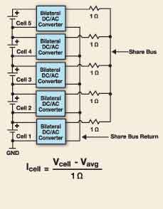 Aeroflex平(ping)衡(heng)電(dian)路(lu)使(shi)用(yong)共(gong)享(xiang)總(zong)線(xian),這(zhe)個(ge)總(zong)線(xian)的(de)電(dian)壓(ya)等(deng)於(yu)所(suo)有(you)電(dian)池(chi)的(de)平(ping)均(jun)電(dian)壓(ya)。平(ping)衡(heng)電(dian)路(lu)由(you)那(na)些(xie)超(chao)過(guo)共(gong)享(xiang)總(zong)線(xian)電(dian)壓(ya)的(de)電(dian)池(chi)充(chong)電(dian)並(bing)將(jiang)電(dian)能(neng)注(zhu)入(ru)到(dao)電(dian)壓(ya)較(jiao)低(di)的(de)電(dian)池(chi),這(zhe)個(ge)工(gong)作(zuo)是(shi)通(tong)過(guo)高(gao)效(xiao)率(lv)的(de)雙(shuang)邊(bian)DC/AC轉換器來完成的。