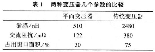 由表1可知,平麵變壓器的漏感僅為傳統變壓器的1/5,交流阻抗也僅為l/3,由此可見這將大大提高變換器的工作特性。而且,由於結構的更加緊湊,使得可以使用更小的RM8磁芯。