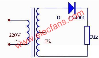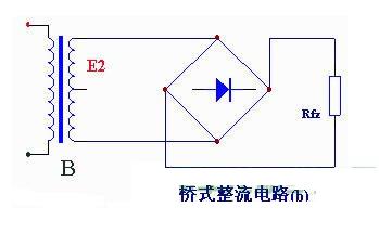 上圖是一種最簡單的整流電路。它由電源變壓器B、整流二極管D和負載電阻Rfz,組成。變壓器把市電電壓(多為220伏)變換為所需要的交變電壓e2,D再把交流電變換為脈動直流電。