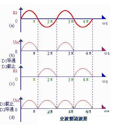這種除去半周、圖下半周的整流方法,叫半波整流。不難看出,半波整說是以"犧牲"一半交流為代價而換取整流效果的,電流利用率很低(計算表明,整流得出的半波電壓在整個周期內的平均值,即負載上的直流電壓Usc=0.45e2)因此常用在高電壓、小電流的場合,而在一般無線電裝置中很少采用。