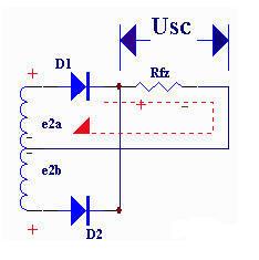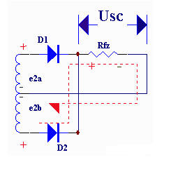 quanbozhengliudianlu,keyikanzuoshiyoulianggebanbozhengliudianluzuhechengde。bianyaqicijixianquanzhongjianxuyaoyinchuyigechoutou,bacizuxianquanfenchenglianggeduichengderaozu,congeryinchudaxiaoxiangdengdanjixingxiangfandelianggedianyae2a、e2b,構成e2a、D1、Rfz與e2b、D2、Rfz,兩個通電回路。