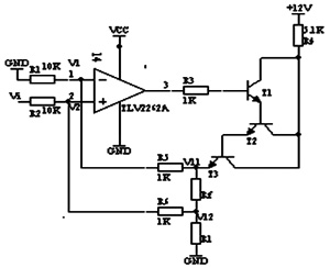 電壓-電流轉換模塊由精密運放與3個晶體管組成的達林頓管電路構成。轉換電路利用晶體管平坦的輸出特性和深度負反饋電路使輸出電流穩定。如圖2所示,此V/I轉換電路的帶負載能力強,電流輸出範圍達0~3A。輸出電流Io經反饋電阻Rf得到一個反饋電壓Vf,Vf=V11-V12,通過R5、R6加到運算放大器的兩輸入端,設運放兩端的電為V1、V2,Vi由單片機DAC輸出。因為理想運放的輸入電流約等於零,且V1=V2,則有V12[1-R6/(R2+R6)]+ViR6/(R2+R6)=V11R1(R1+R6)。由於V12=V11-Vf,則V11R2/(R2+R6)+(ViR6-VfR2)/(R2+R6)=V11R1/(R1+R5)。令R1=R2=10kΩ,R5=R6=1kΩ,則有Vf=ViR6/R2=Vi/10。若暫不考慮反饋時,Io=Vi/(10Rf)。