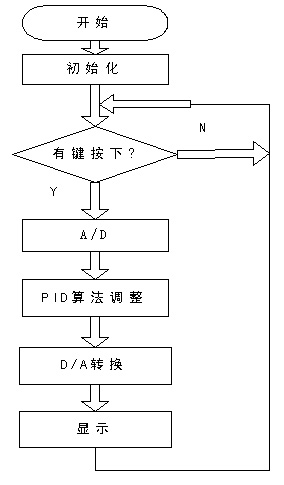 在工作過程中,SPCE061A單片機將被預置的電流值通過換算進行D/A轉換,以輸出電壓驅動V/I轉換電路實現電路輸出,並將該電流值對應的電壓值通過閉環回路,經A/D轉換後輸入單片機係統,再通過PID算法調整電流輸出。整個係統工作流程圖如圖4所示。