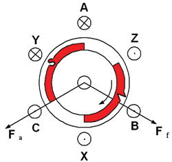 得知Hall輸出信號與轉子磁動勢位置的關係之後,可以產生正六邊形的旋轉磁場,如圖4所示,AB相繞組通電,產生圖中合成磁勢Fa,由於Fa的牽引,Ff將會順時針旋轉,旋轉到X位置後,換成給AC相通電,則Fa順時針跳躍60°電角度,牽引Ff順時針旋轉60°,依次類推,通電順序按照AB-AC-BC-BA-CA-CB-AB循環,則帶動永磁轉子順時針旋轉。這就是傳統的方波控製方式。