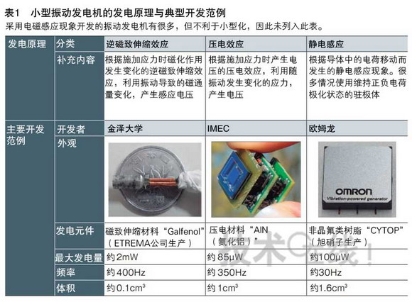 日本金澤大學上野敏幸副教授開發出了尺寸雖小卻可獲得較大發電量的振動發電機。盡管外形尺寸僅為約2mm×3mm×12mm,但振動頻率達到約400Hz時卻可獲得約2mW的發電量(表1)。