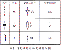 所謂S變換,就是用S乘以R、C、L。其結果就是把電阻變換為電感,電容變換為電阻,並將電感變換為頻變電阻。但這裏的頻變電阻是與S2成正比的。圖2給出了S變換的元件變換關係圖。